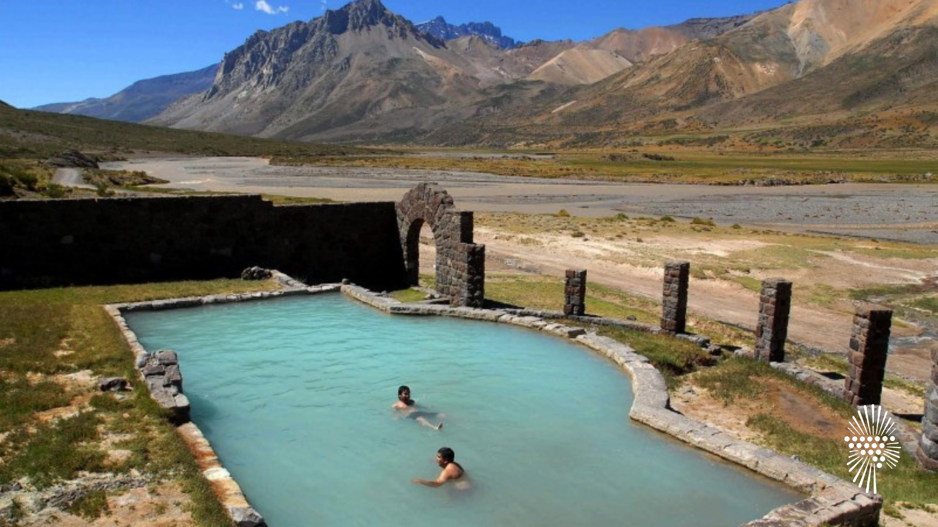 A pocos metros del hotel abandonado, se encuentran los pozones naturales de agua termal, al aire libre, rodeados de piedras, y con vista directa a la cordillera. El agua emerge caliente y con fuerte olor a azufre, y se distribuye en pequeñas piletas artesanales donde uno puede meterse, relajarse, y sentir la temperatura natural que contrasta con el aire fresco de la montaña.